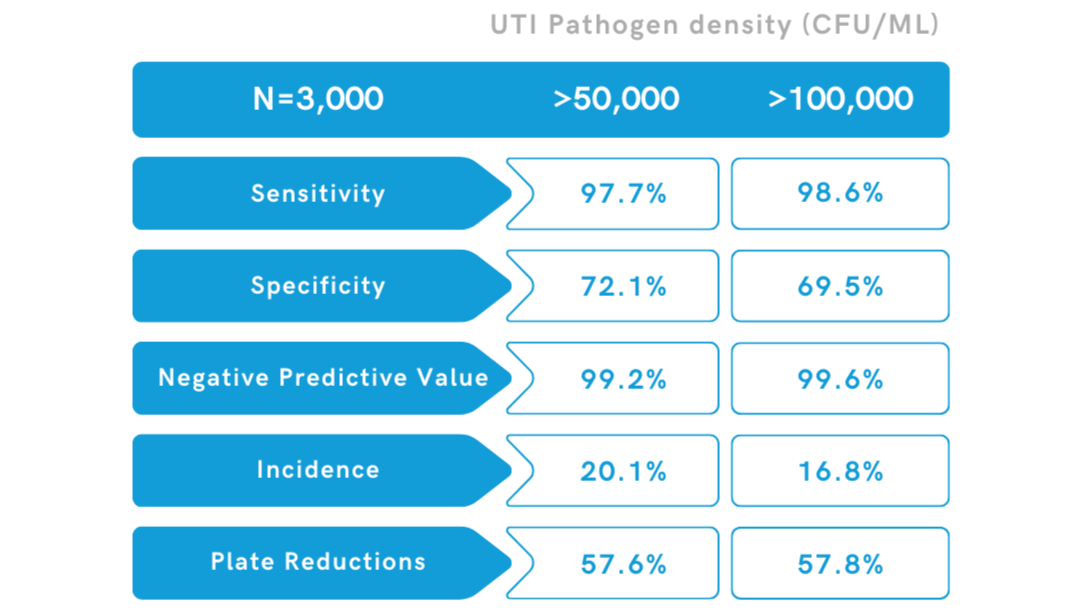 When evaluating specimens with uropathogens present at 50,000CFU/mL or greater, BacterioScan delivers: 97.7% Sensitivity and 99.2% Negative Predictive Value.